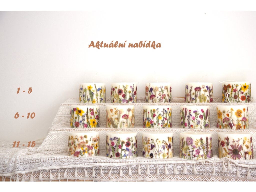 Na produktové fotografii najdete aktuální nabídku našich ručně vyráběných svíček. Každá je očíslovaná a jedinečná. Vyberte si tu, která vás nejvíce osloví, a číslo zapište do poznámky v košíku.