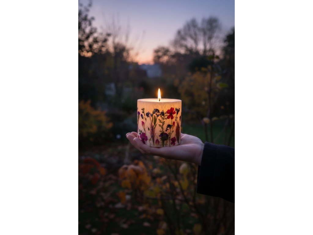 Naše střední kulatá svíčka Flamea o rozměrech 9x9 cm je skvělým spojením estetiky a praktičnosti. Ručně vyráběná svíčka je zdobená skutečnými vylisovanými květinami, které si uchovávají svou krásu. Je to ideální doplněk, který se hodí na střed stolu, poličku nebo do jakéhokoli interiéru. Po dohoření se, s trochou péče, promění v elegantní lampion, který vám bude sloužit jako krásná dekorace po dlouhou dobu.